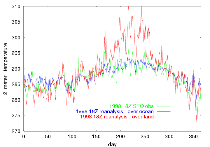 The above image shows the 1998 18Z observation of temperature at SFO, and the NCEP 18Z reanalysis at the ocean point just to the west of SFO, and the NCEP 18Z reanalysis at the land point just to the east of SFO. |