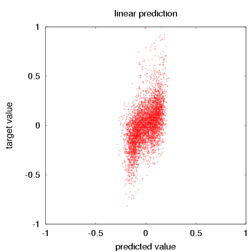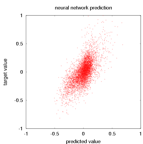| The SFO surface air temperature vs. the neural network prediction for the verification data. The mean square error (error=prediction-target) is 0.0231. The mean square of the target is 0.0417. The skill score is thus 0.446. (For the training data, those numbers were 0.0218, 0.0391 and 0.442). | The SFO surface air temperature vs. the the singular value decomposition prediction for the verification data. The mean square error (error=prediction-target) is 0.0296. The mean square of the target is 0.0417. The skill score is thus 0.290. (For the training data, those numbers were 0.0283, 0.0391 and 0.277). |