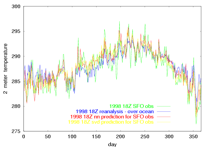 The above image shows the 1998 18Z observation of temperature at SFO, and the NCEP 18Z reanalysis at the ocean point just to the west of SFO, the neural network prediction for the SFO obs, and the SVD prediction for the SFO obs. |