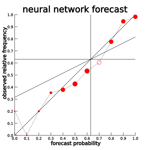 | An attributes diagram showing performance of forecasted probability of clear skies at 10 AM PST, with predictors based on observations at 4 AM PST. The actual observed frequency of occurrence is then plotted against the forecasted probability. The area of the dot is made proportional to number of forecasts at that probability. The frequency of occurrence for the entire dataset is about 0.68 for these events. A horizontal "no resolution" line is drawn at the climatological frequency. A vertical line is also drawn for a forecasted probability at the observed frequency. A "perfect reliability line" is drawn with a slope of 1, and a "no skill" line with half that slope. Open symbols have no skill. |